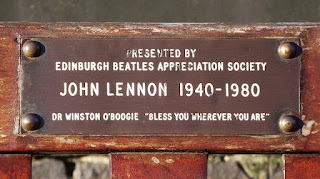 The John Lennon bench is sponsored by the Edinburgh Beatles Appreciation Society. It's in Princes Street Gardens right in the heart of the city. The photograph is by byronv2, who is a 40-something bookseller and blogger living in Edinburgh, Scotland. He has a blog at The Woolamaloo Gazette: www.woolamaloo.org.uk and a Flickr photostream at https://www.flickr.com/photos/woolamaloo_gazette/15108063093/