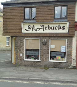 St Arbucks is a coffee shop we saw in Wiltshire a couple of years ago. It doesn't look much like the Starbucks we normally see. There's a fullstop after St. and a capital letter for Arbucks. What a difference punctuation can make! For more perfectly punctuated benches see http://benchsite.blogspot.co.uk/2015/09/perfectly-punctuated-benches-for.html